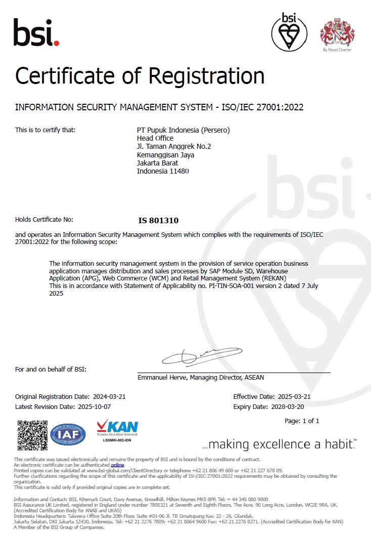 The Information security management system in the provision of service operation business application manages distribution and sales processes by SAP Module SD, Warehouse Application (APG), Web Commerce (WCM) and Retail management System (REKAN) this is in accordance with Statement of Applicability no. PI-TIN-SOA-001 version 2 dated 2 July 2025